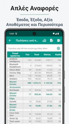 Μην αφήσετε ποτέ τα αποθέματα να σας αιφνιδιάσουν. Θέστε ελάχιστα όρια αποθεμάτων και λάβετε αυτόματες ειδοποιήσεις για έγκαιρη αναπλήρωση, διασφαλίζοντας την αδιάλειπτη ροή των εργασιών σας. Δημιουργήστε λεπτομερείς αναφορές για να υπολογίσετε κέρδη, περιθώρια και markup, ενώ παράλληλα παρακολουθείτε τις ημερήσιες πωλήσεις, τις πωλήσεις ανά είδος ή ανά πελάτη. Για επαγγελματικές ανάγκες, εκτυπώστε καταλόγους, τιμοκαταλόγους, αποδείξεις και τιμολόγια, χρησιμοποιώντας τα παρεχόμενα πρότυπα ή δημιουργώντας τα δικά σας. Όλες οι πληροφορίες σας είναι ασφαλείς και προσβάσιμες, με δυνατότητα εξαγωγής/εισαγωγής δεδομένων σε/από Excel και αξιοποίησης του Google Drive για ανταλλαγή και δημιουργία αντιγράφων ασφαλείας.
