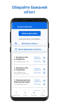 Η εφαρμογή παρέχει ευέλικτες επιλογές αναζήτησης για να καλύψει κάθε σας ανάγκη. Μπορείτε να εντοπίσετε πληροφορίες προσώπων εισάγοντας το πλήρες ονοματεπώνυμο ή τον αναγνωριστικό τους κωδικό, είτε πρόκειται για φυσικό πρόσωπο είτε για νομική οντότητα με βάση την επωνυμία ή τον κωδικό EDRPOU της. Παράλληλα, η δυνατότητα αναζήτησης μέσω ακινήτου σάς επιτρέπει να αποκτήσετε λεπτομερή στοιχεία χρησιμοποιώντας τον κτηματολογικό αριθμό μιας έκτασης ή τον αριθμό καταχώρησης ενός συγκεκριμένου ακινήτου. Αυτή η διπλή προσέγγιση εξασφαλίζει ότι θα βρείτε τα δεδομένα που χρειάζεστε με ακρίβεια και ταχύτητα.